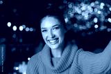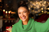 Magic Christmas time. Happy European lady taking selfie or recording video invitation at home in room decorated with garland lights