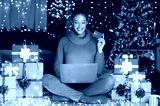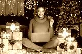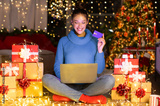 Christmas shopping online. Happy lady with credit card and laptop buying Xmas gifts, sitting in decorated room in the evening with gift boxes and lights