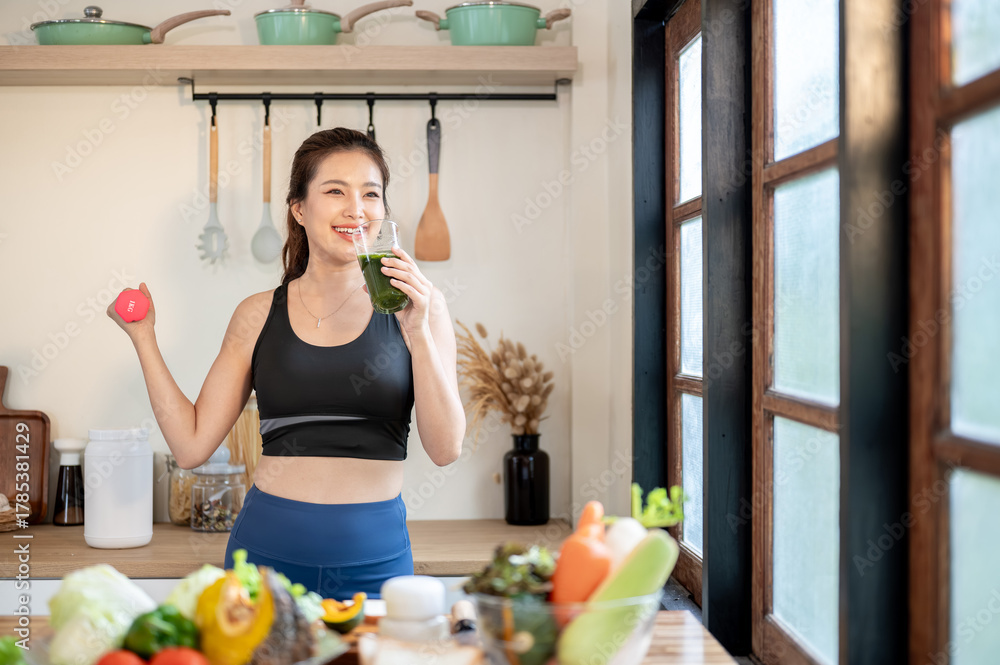 Asian sportswear woman drinking vegetable juice and doing dumbbell exercising aside kitchen counter.