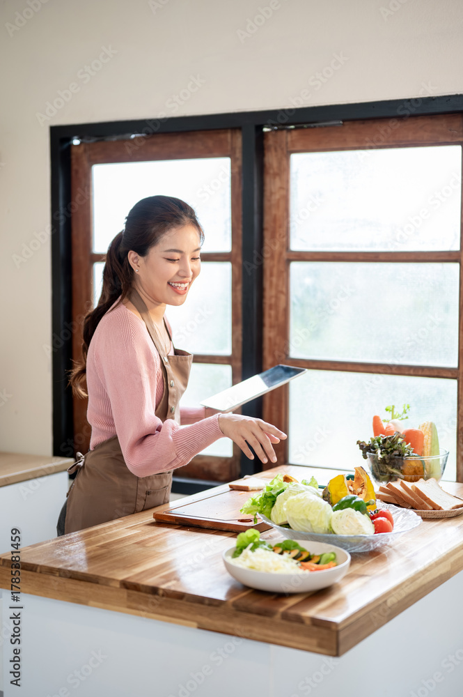 Asian woman holding tablet looking vegetable ingredient making a sandwich at kitchen cooking counter