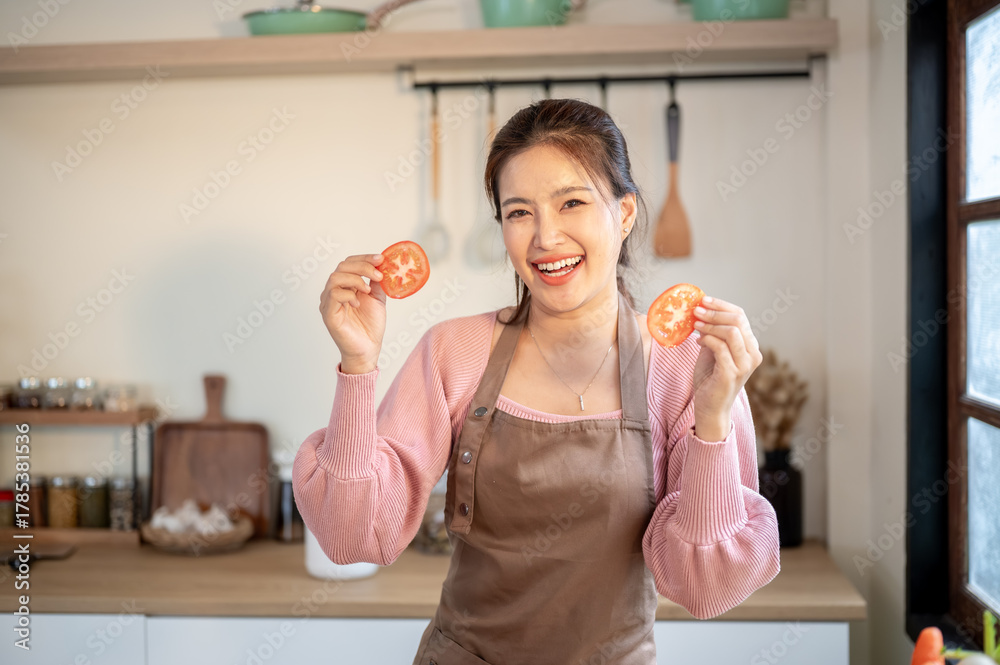 Happy asian woman wearing apron holding and showing tomato slices while cooking at kitchen counter.