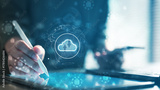 digital, transformation, network, crm, erp, analytics, report, Hand using stylus on tablet with digital cloud network interface, representing CRM, ERP, and data integration in business transformation.