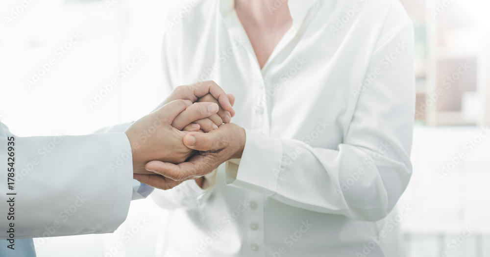 healthcare, service, clinic, doctor, patient, diagnosis, treatment, consultation, Doctor holding patient’s hand showing care, compassion, and trust in healthcare service and medical treatment.