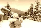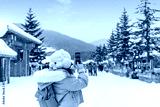 Young happy woman tourist taking photo and enjoying full of fluffy snow at China Snow town in winter