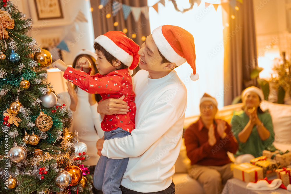 family, christmas, happy family, families, celebration, festive, festivity, asian family, children, Asian family celebrating Christmas together by decorating a Christmas tree at home.