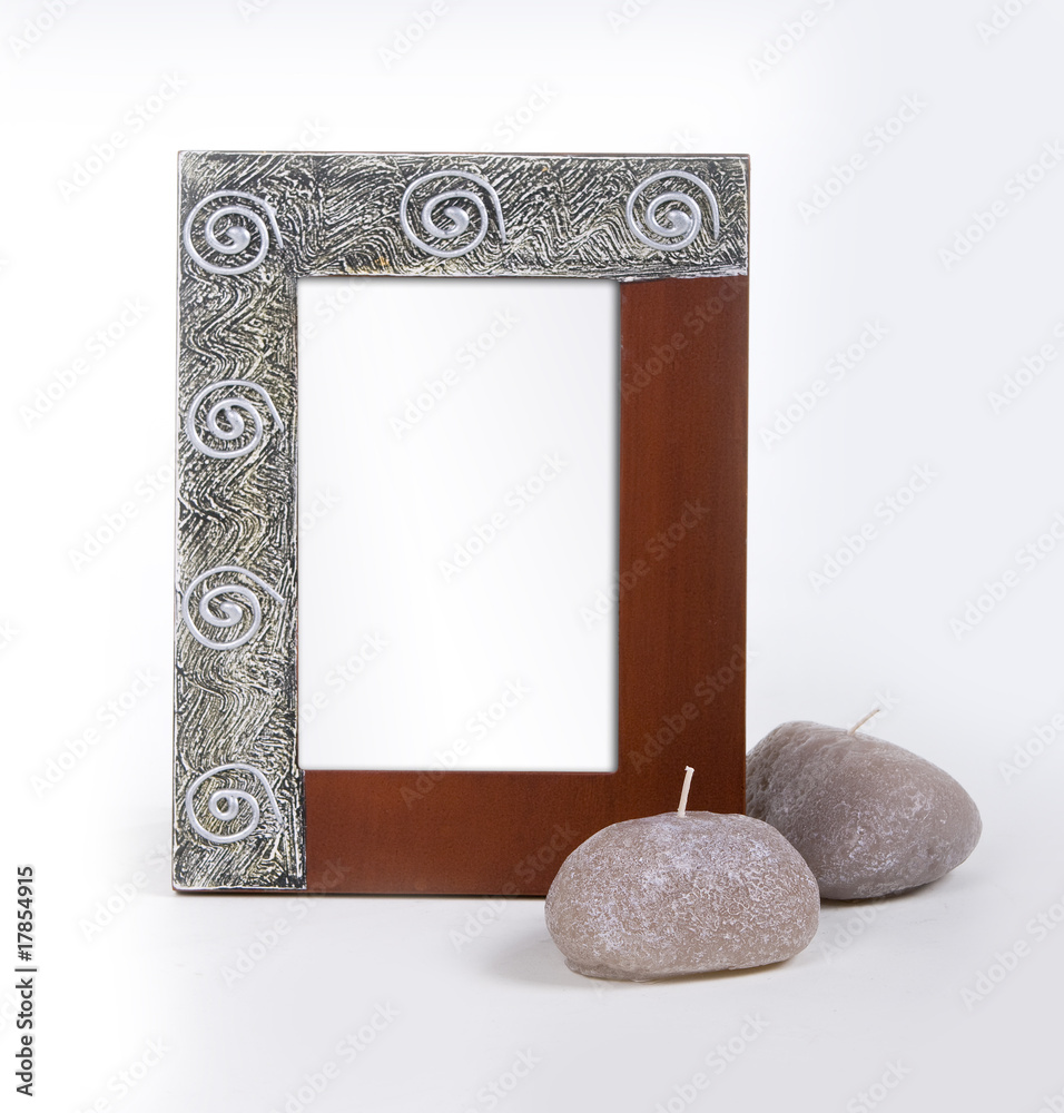 stylish photo frame with a candle laying by it