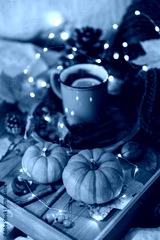 Glass of hot steaming tea and autumn plants