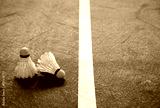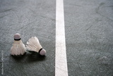 two shuttlecocks for badminton sport playing on dark green for with white line in gymnasium background