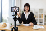 Caucasian woman wearing black suit recording video blog in office environment using smartphone on tripod