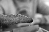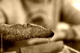 A boy holding a delicious crispy chicken strip served with a side of vibrant barbacue sauce