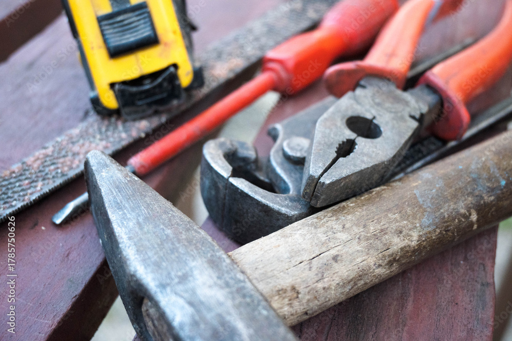 Workshop tools on a workbench, DIY.