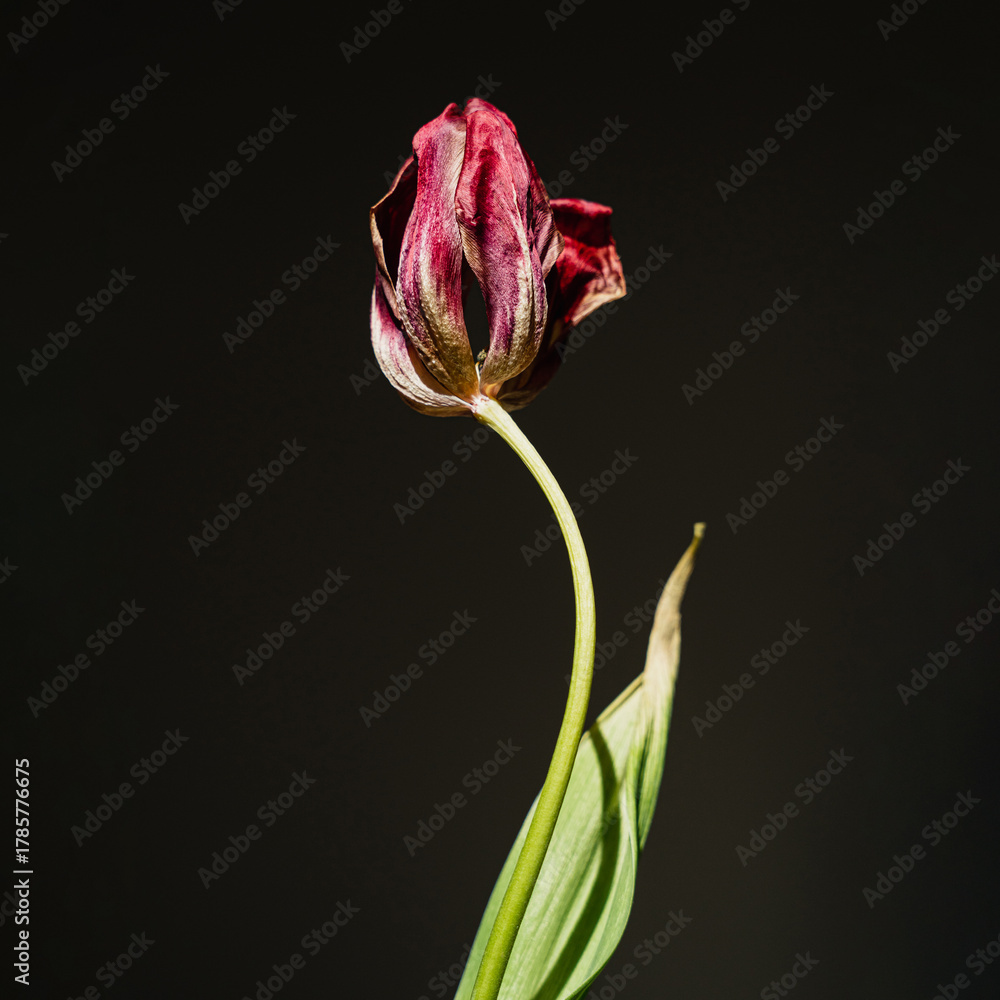 Fresh tulip blossom featuring rich burgundy hues against dramatic black surface