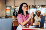 Business people celebrate during a team meeting