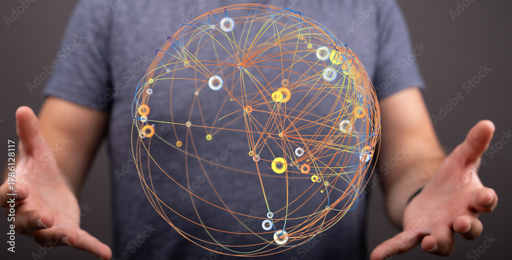 Conceptual image of a person holding a digital network globe, symbolizing global connections, data, and communication. This can repre