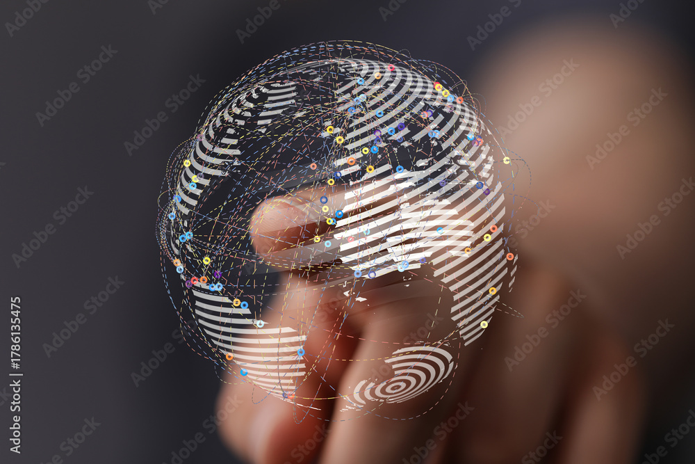 Abstract image depicting the world, technology and the connection between humans. Futuristic network around a digital sphere.