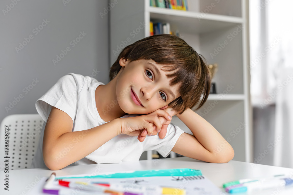 Smiling child resting at a desk with drawing supplies in a creative study space.