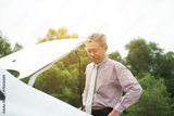 asian senior male with broken car