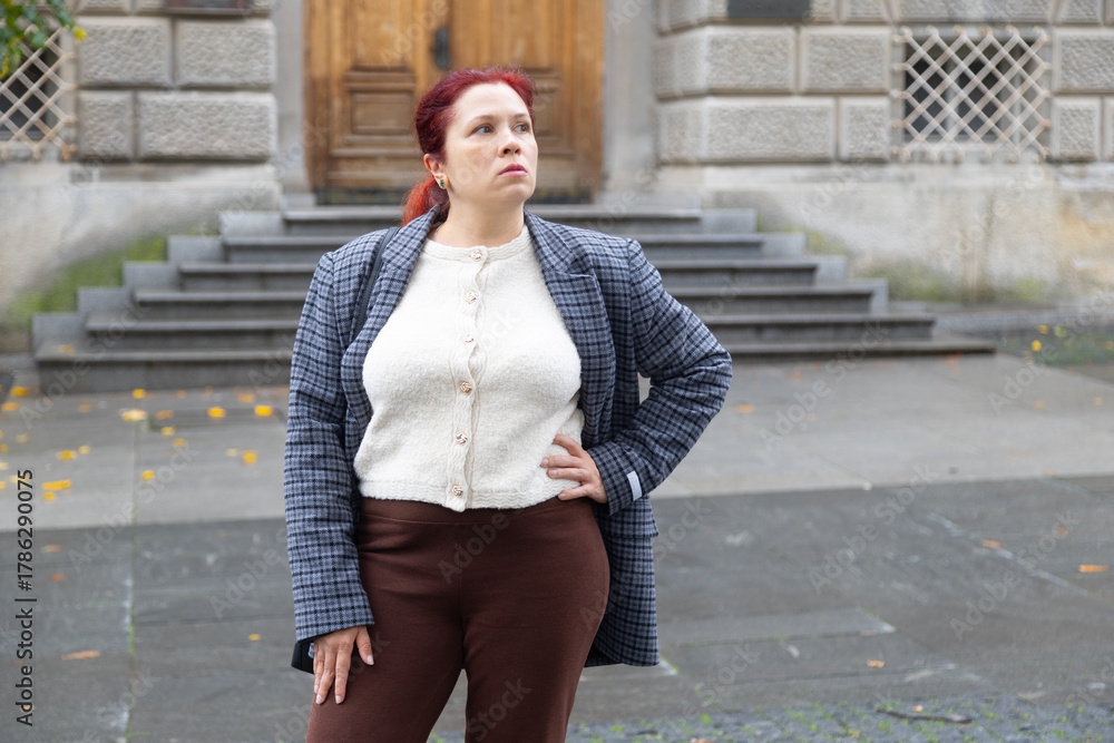 Woman standing near old building with stone steps. Copy space and empty place for advertising. Confidence, independence, and calm focus in urban surroundings.