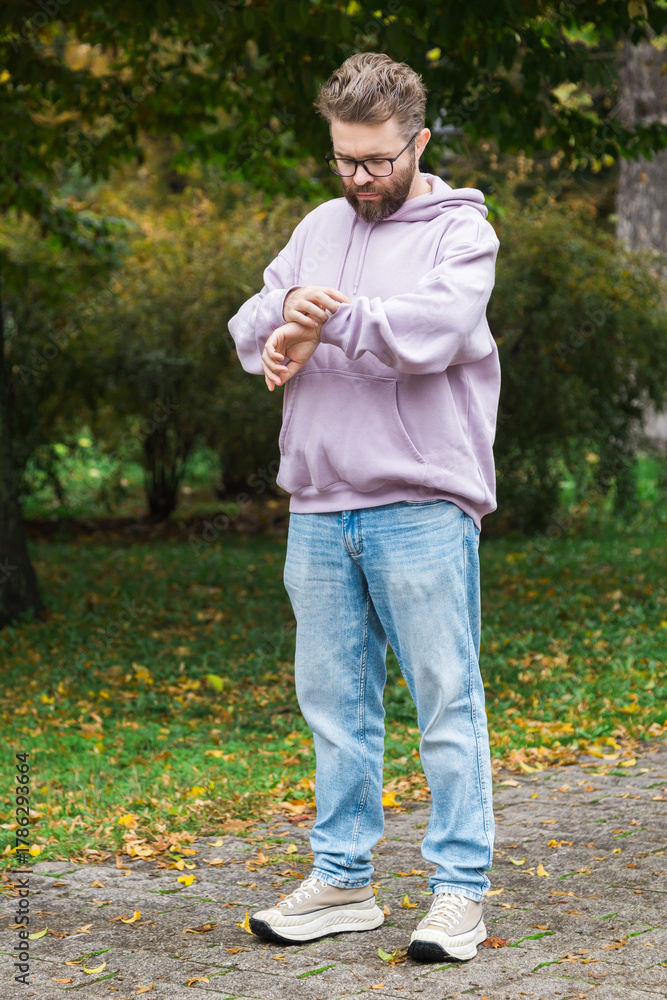Man looking at wristwatch in park. Time, mindfulness, and balance in daily routine.
