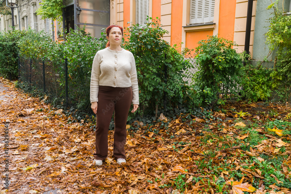 Woman standing near orange building in autumn leaves. Copy space and empty place for advertising. Urban calm, seasonal atmosphere and reflection.