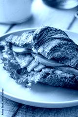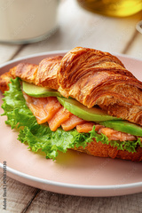 Fresh croissant sandwich filled with smoked salmon, avocado slices and lettuce served on pink plate