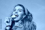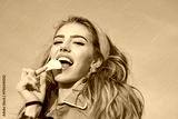Chips food advertising concept. Snack brand lifestyle photo. Woman eating chips outdoor. Tasty and crispy potato chips. Cheerful model with snack. Trendy girl eating crisps. Outdoor snack chips.