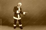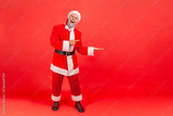 Full length of amazed elderly man with gray beard in santa claus costume pointing at copy space on his palm, looking at camera with excited expression.