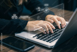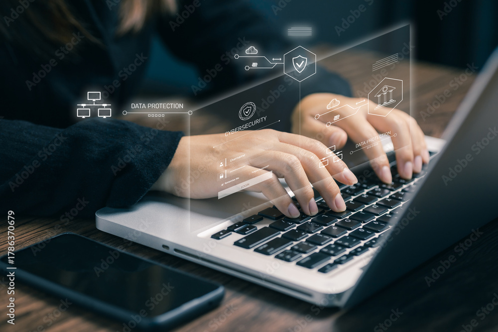 Close-up of a woman typing on laptop with virtual cybersecurity and data protection icons. Concept of digital privacy, network security, and online information safety for business technology.