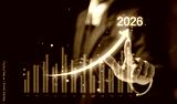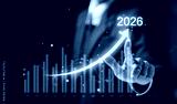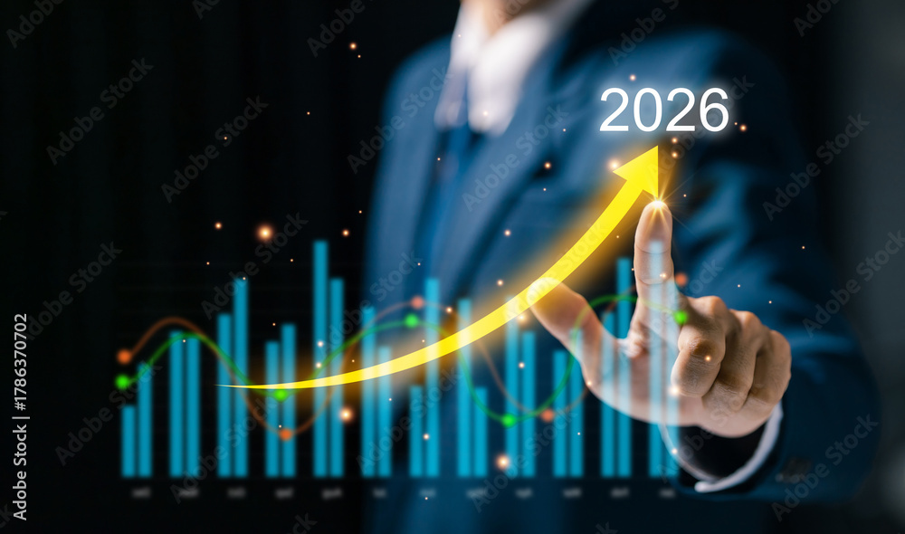 Businessman pointing upward arrow with 2026 number over digital chart background. Concept of financial growth, business success, and economic forecast for the upcoming year.
