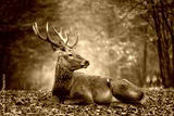 Majestic stag resting among autumn leaves in a tranquil forest setting during the golden hour