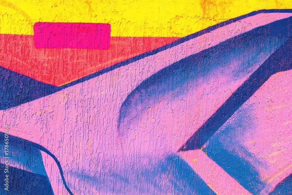 Abstract graffiti featuring bold pink, blue, yellow. 80s pop art style, vibrant texture, geometric shapes. Creative banner, urban art installations, modern 90s pop culture visuals.