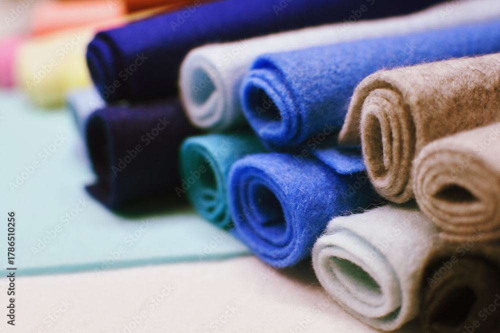 積み重なった寒色のフェルト生地のクローズアップ 手芸 裁縫 布 ハンドメイド