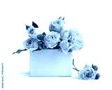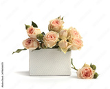 Gift box with beige cream rose flower bouquet on gray neutral background. Minimal empty pedestal podium for product presentation scene.