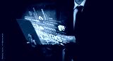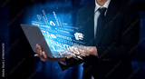 A business professional showcases technology trends using a laptop. The image highlights topics like data analysis, cloud computing, and machine learning in a digital format. Tessel