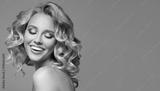 Blonde woman with curly beautiful hair smiling on gray background.