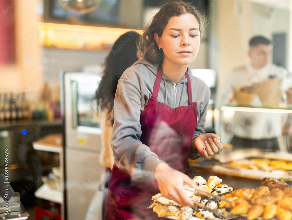 Girl canteen worker waits for customers near bakery counter, ready willing to sell fresh bun, help them choose and buy snack to go.
