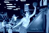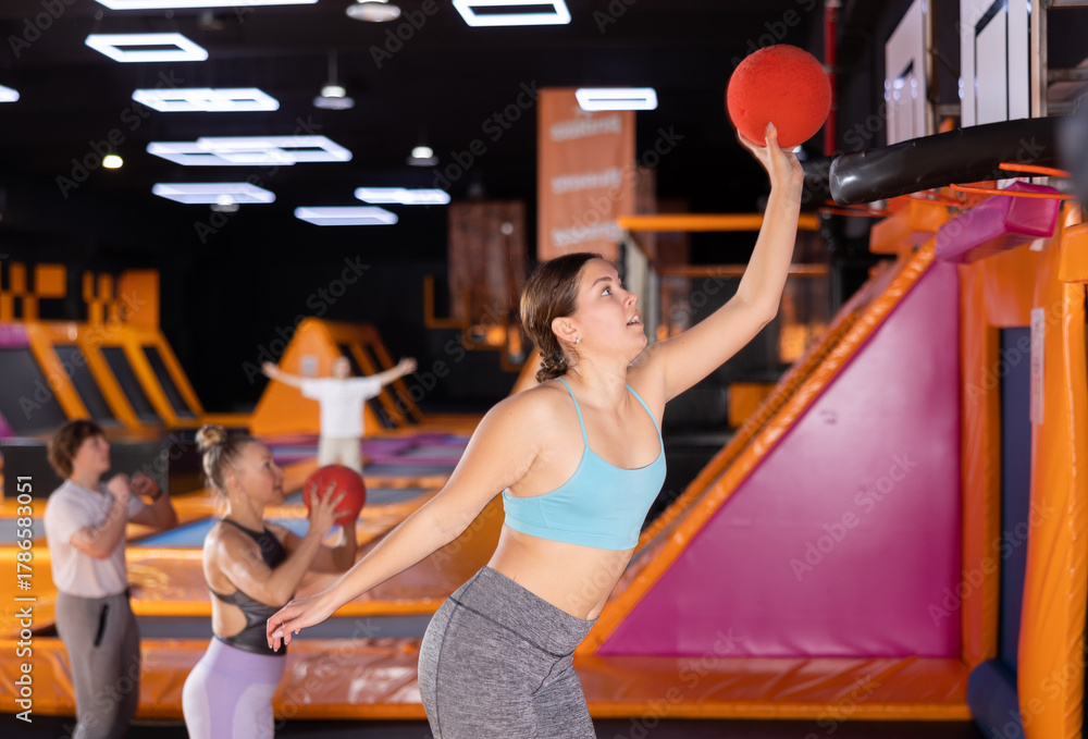 Cheerful young European female in sportswear playing basketball while bouncing on colorful trampolines indoors in leisure sports center