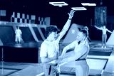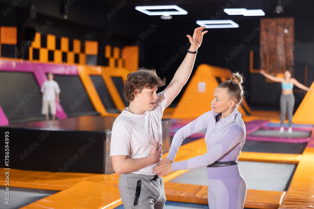 Skilled female trainer helping young guy warming up and preparing for exercising on trampolines in sports center