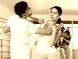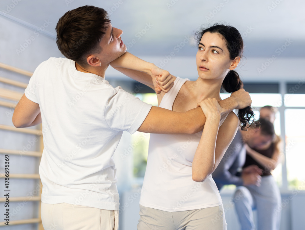 Young woman and young guy training self-defense techniques in studio..