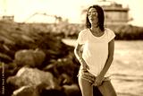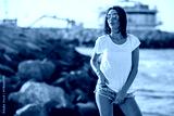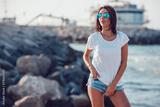 Girl in a white t-shirt on the background of the ocean. Mock-up.