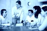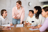Young teacher discussing her notes with group of grown-up students excitedly around the table