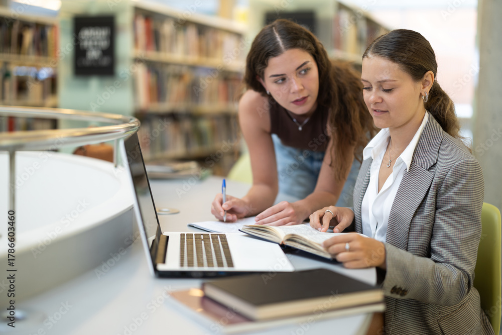 In library, girl student uses public laptop and listens to female friends advice, asks for help in assessing information. Student analyzes information on Internet, searches for information online
