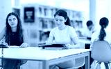Two female student sits at table in library and studies, reads books and takes notes, makes summary. Preparation for exams, educational process, additional classes.....