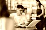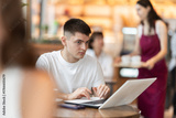 Young man cafe visitor sits at table with laptop, reads incoming emails and drinks strong coffee. Client is preparing for important meeting, reading text content of report
