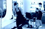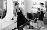 Young female hairdresser stylist gives haircut to adult female client in salon