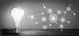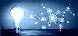 This captivating image features a light bulb filled with gears, symbolizing innovation and ideas, alongside graphic icons depicting business connections and networking. Tessel
