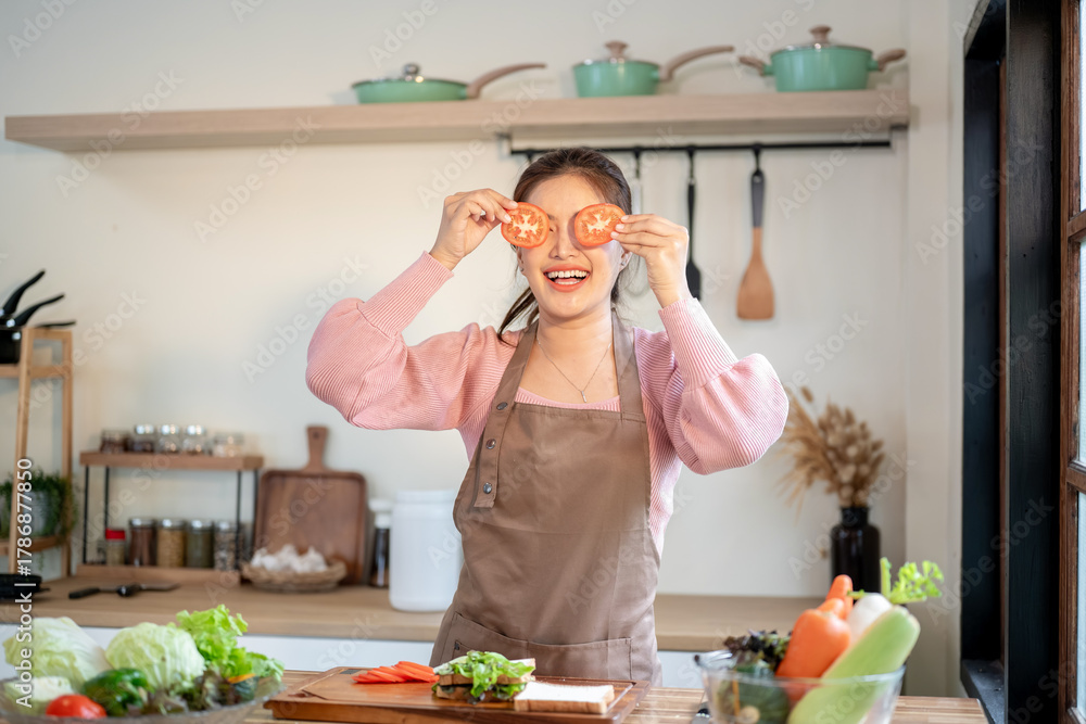 Asian woman wearing apron holding playing with tomato slice while making sandwich at kitchen counter