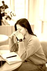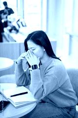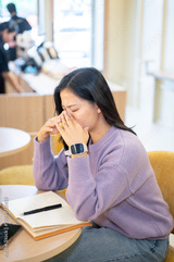 Asian woman closing eyes getting tired after long hours working or study as sitting at table in cafe