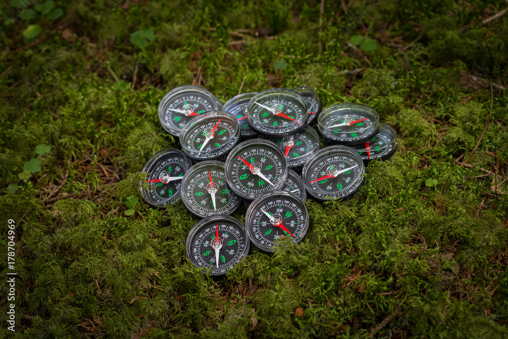Small black compasses on moss