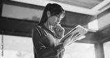 Thinking, business and woman with tablet, below and news agency with planning for column. Mature person, low angle and journalist in office, tech and problem solving with deadline, ideas and solution